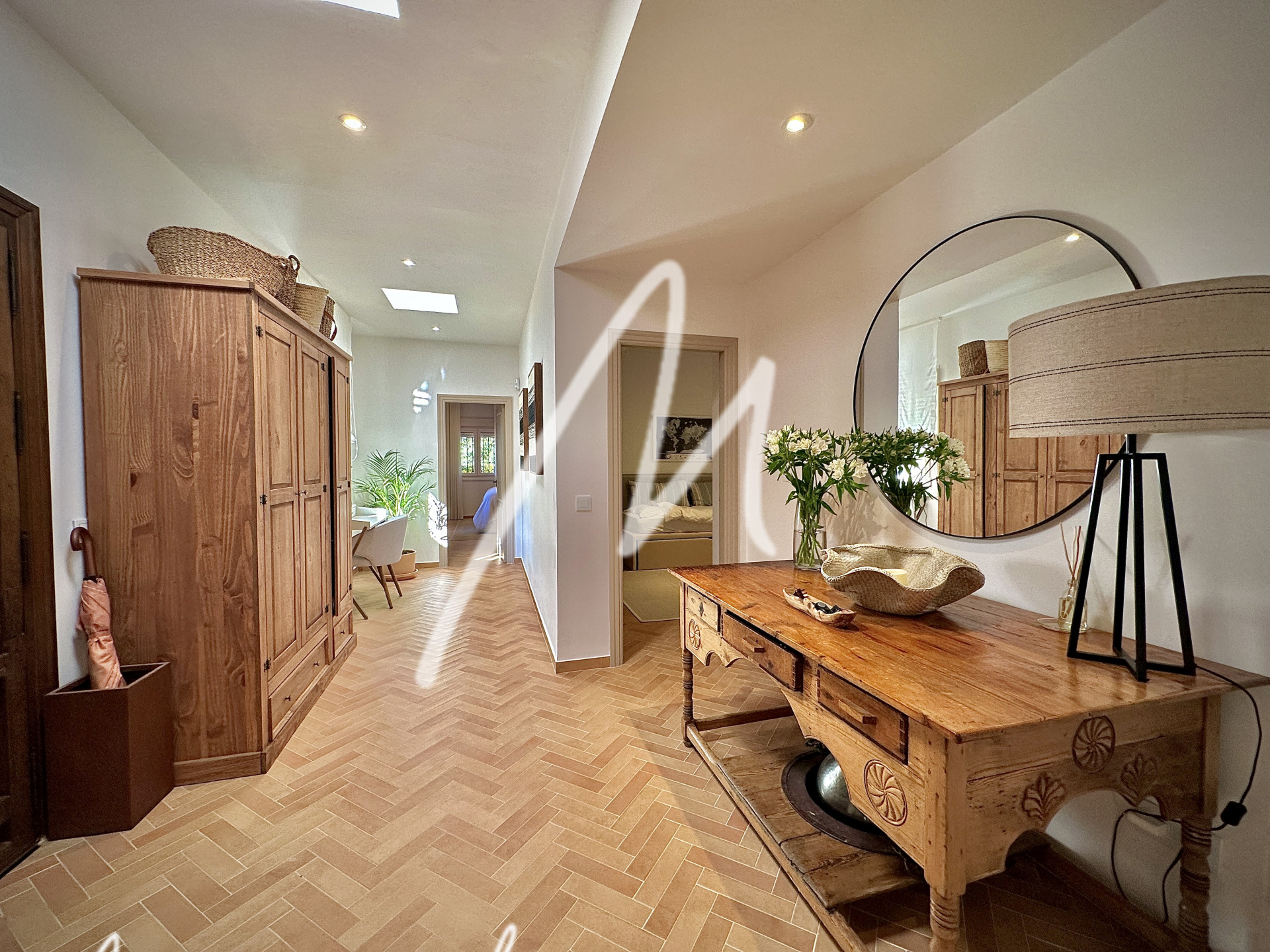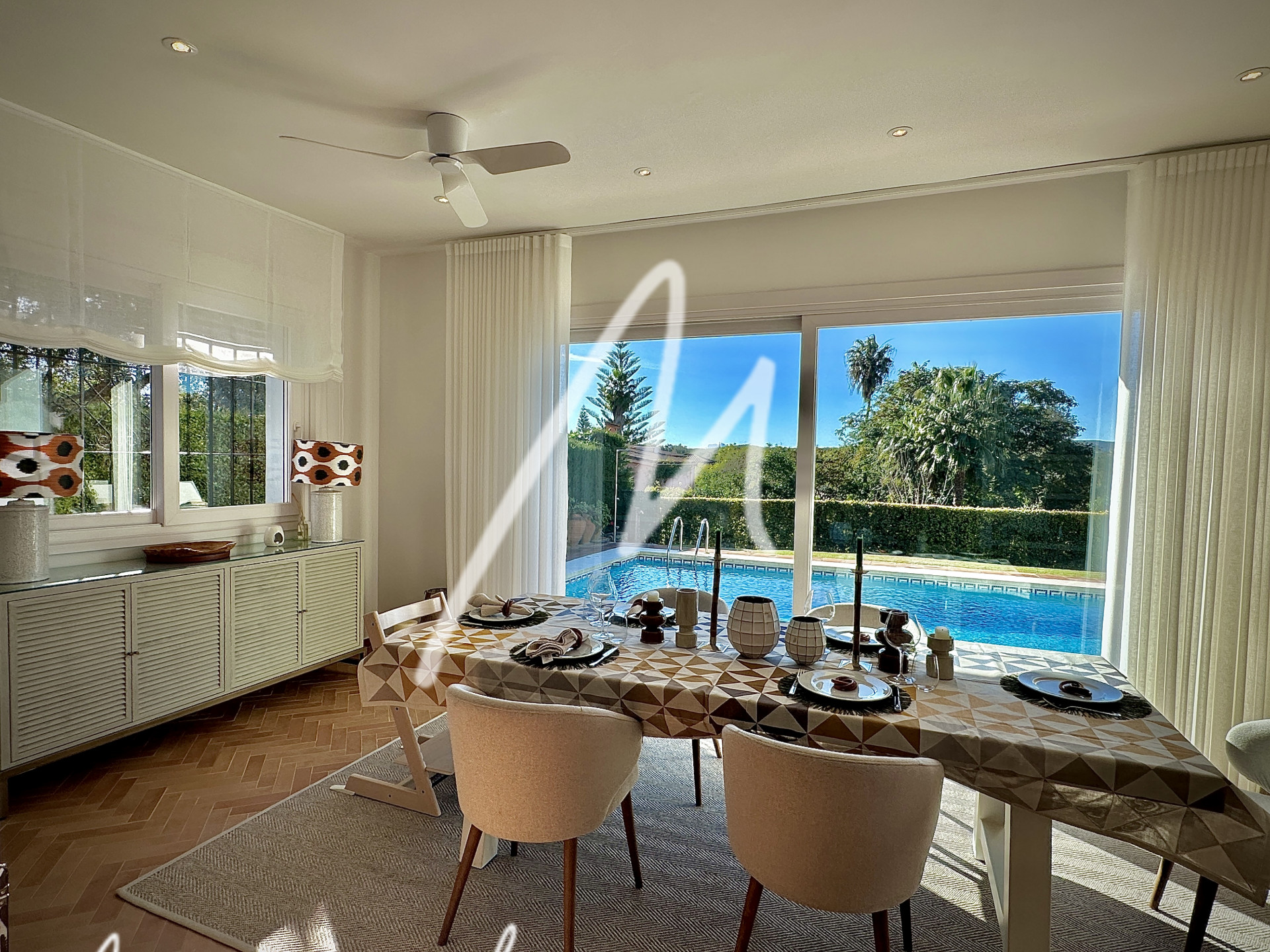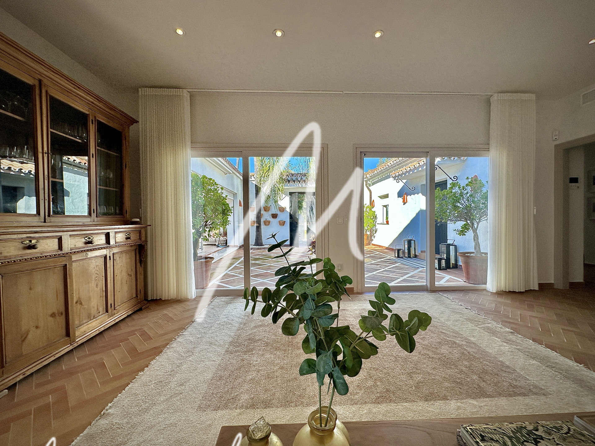 The terrace area features an additional refrigerator, bar area, and awning for the summer dining area in the inner courtyard. The house has air conditioning with an airzone system to each bedroom and living room, as well as silent Faro fans in all rooms including the pool porch.