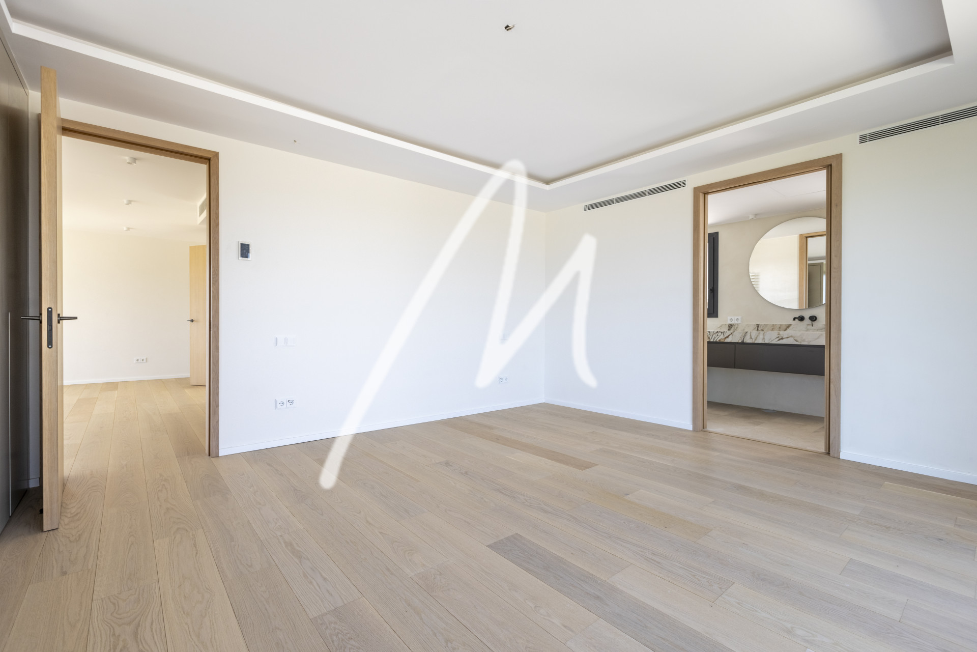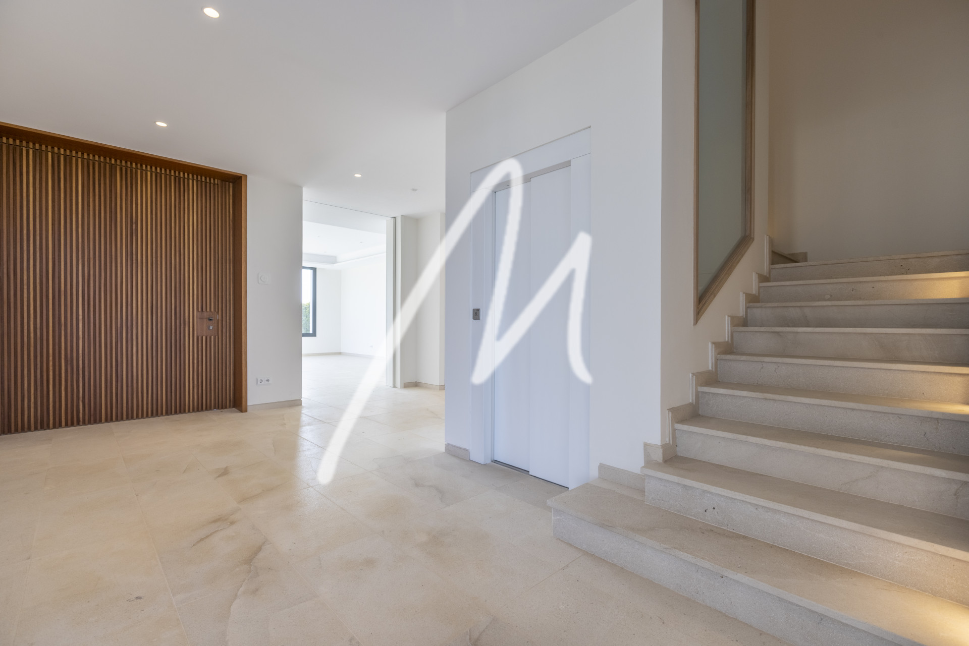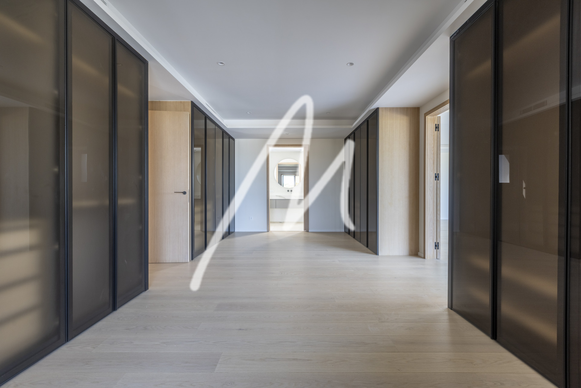 We are welcomed by an impressive Iroko wood folding door and a large entrance hall from where we perceive a wide range of spaces in which everything invites us to relax…. spacious living room, kitchen with dining area both by a large porch area open to the garden and its infinity pool of 12 x 4 meters, which blends visually with the landscape and the panoramic view, creating an experience of serenity and luxury. In addition, this floor also has a second living room where you can place a games room, office, television, etc. ….