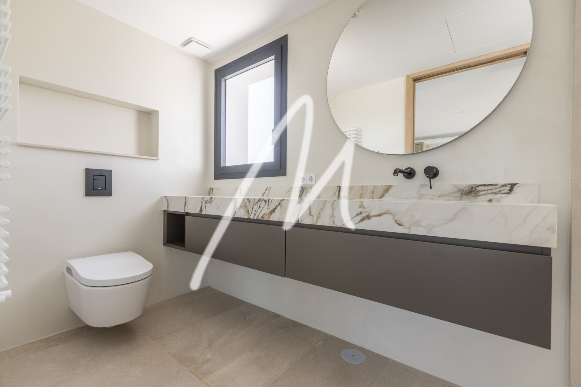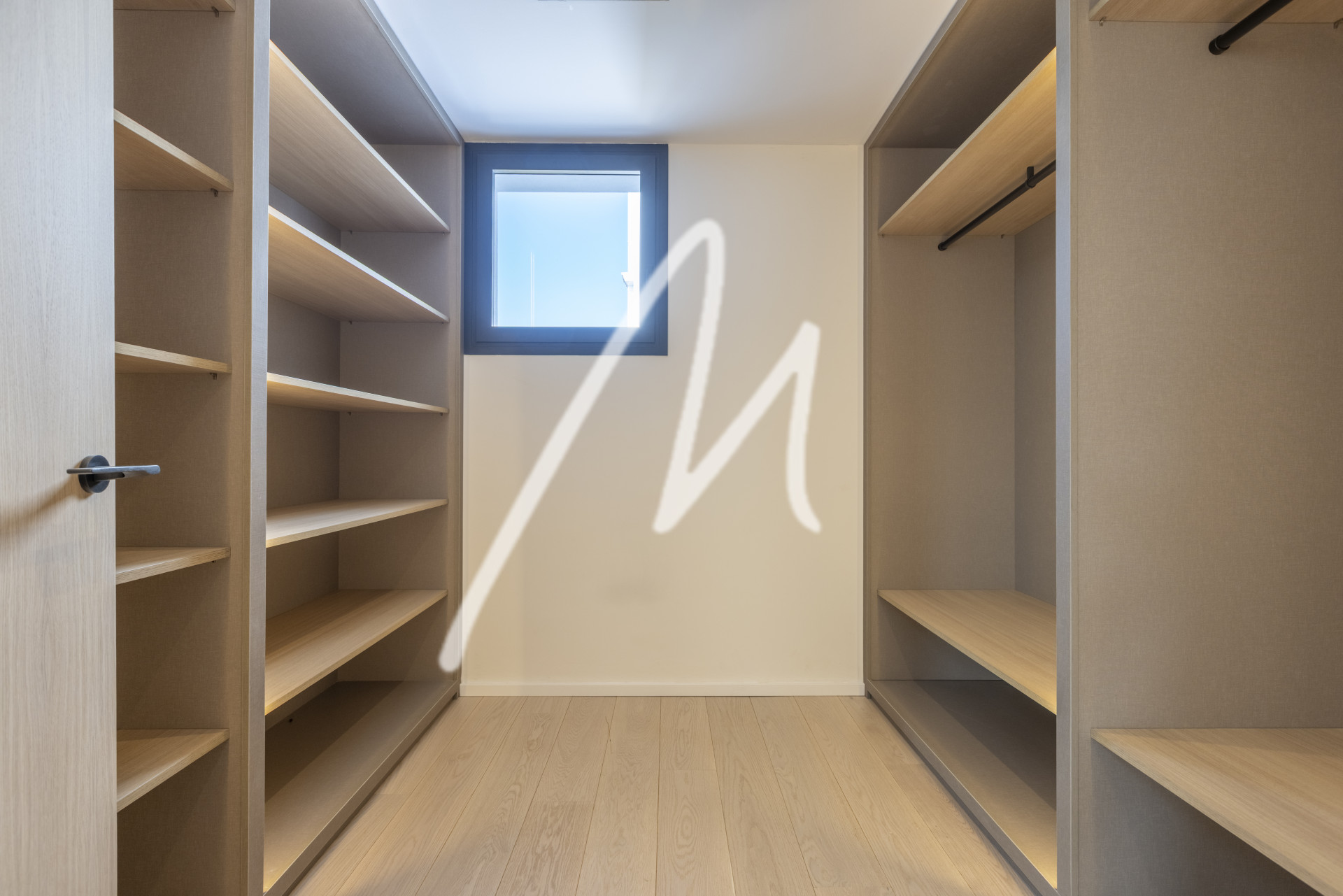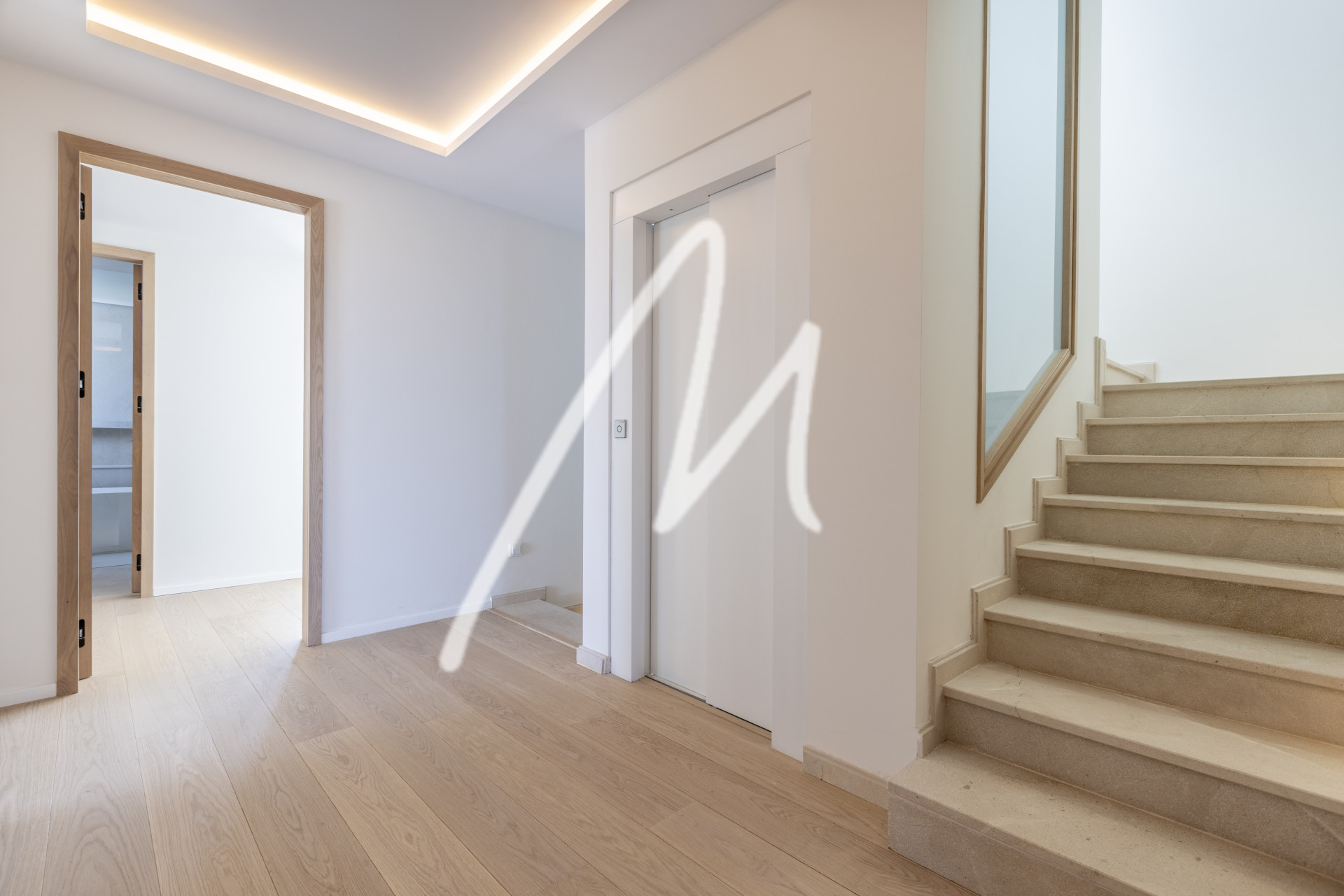 We are welcomed by an impressive Iroko wood folding door and a large entrance hall from where we perceive a wide range of spaces in which everything invites us to relax…. spacious living room, kitchen with dining area both by a large porch area open to the garden and its infinity pool of 12 x 4 meters, which blends visually with the landscape and the panoramic view, creating an experience of serenity and luxury. In addition, this floor also has a second living room where you can place a games room, office, television, etc. ….