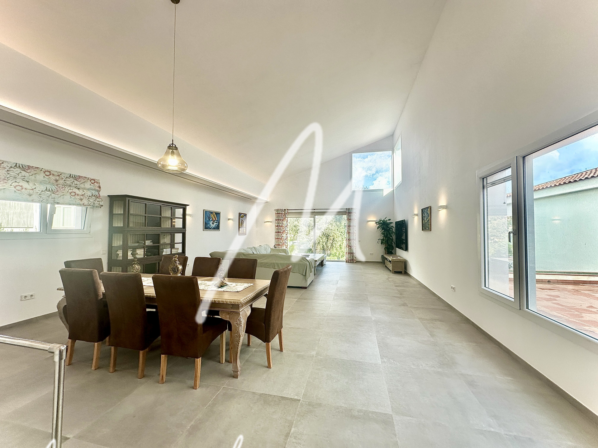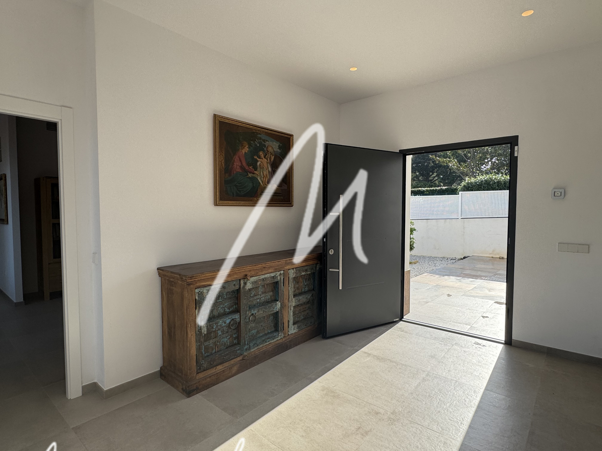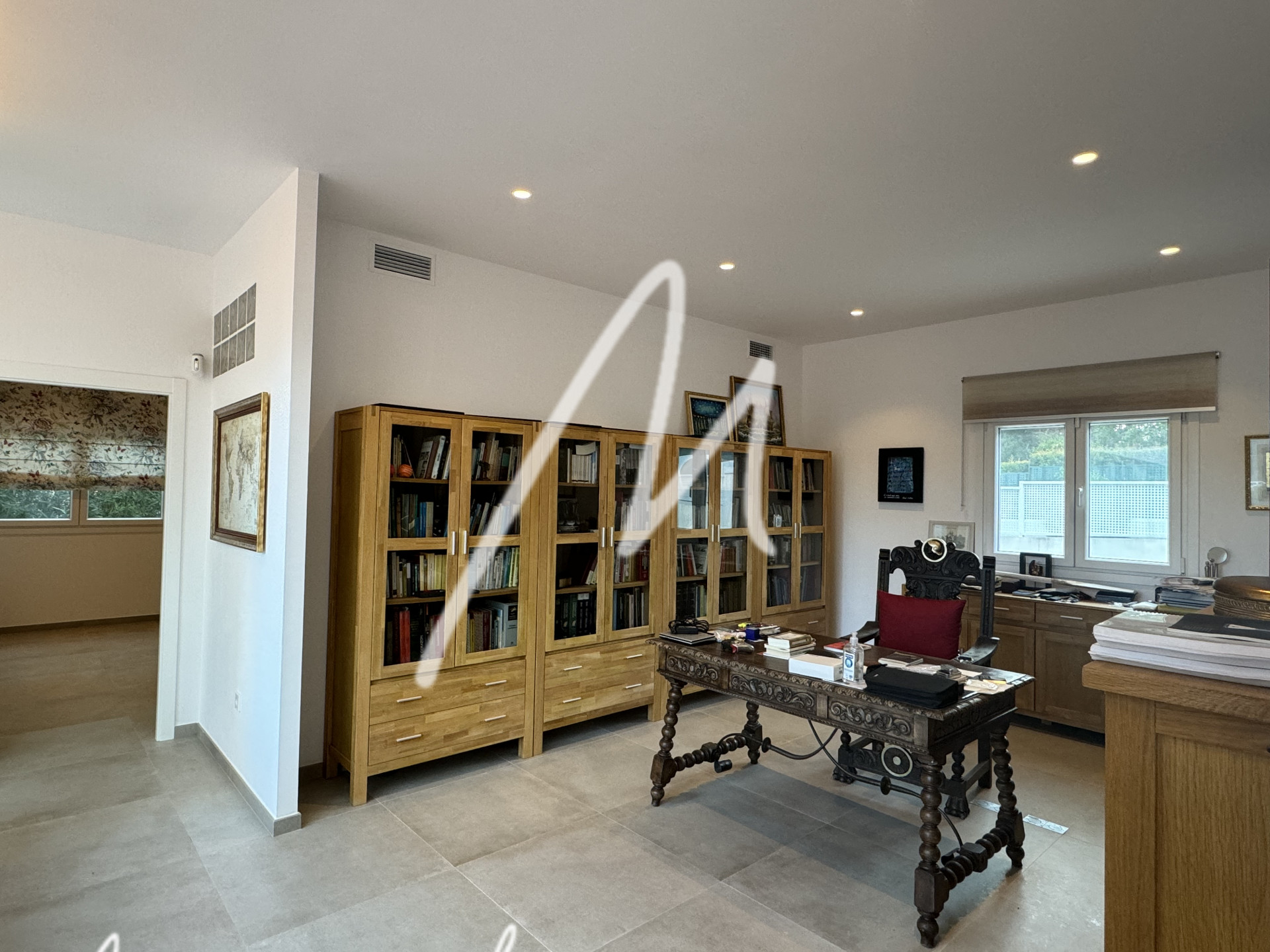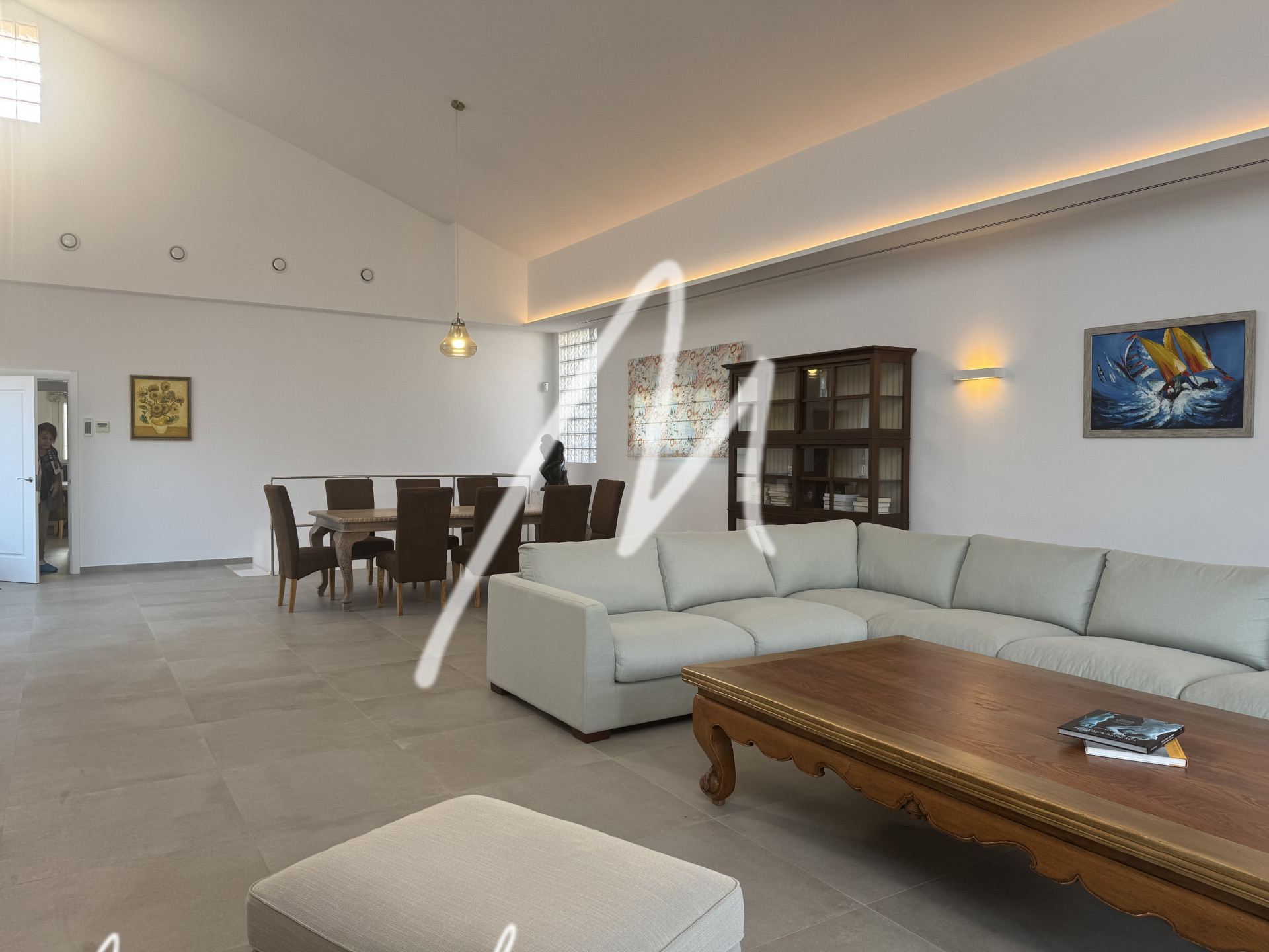 The villa is distributed over two floors, with the main floor organized around the central courtyard to ensure optimal sunlight in all rooms. Featuring a spacious high-ceiling living room, it includes 4 large bedrooms with en-suite bathrooms, as well as an additional guest toilet, ensuring comfort and privacy for all occupants. The fully equipped kitchen is designed to meet the most demanding needs and also includes an independent laundry room. The lower floor features a large multipurpose room with access to the saltwater pool, garden, and barbecue area, ideal for enjoying the Mediterranean climate. Additionally, there is a spacious storage room, providing practical storage solutions.