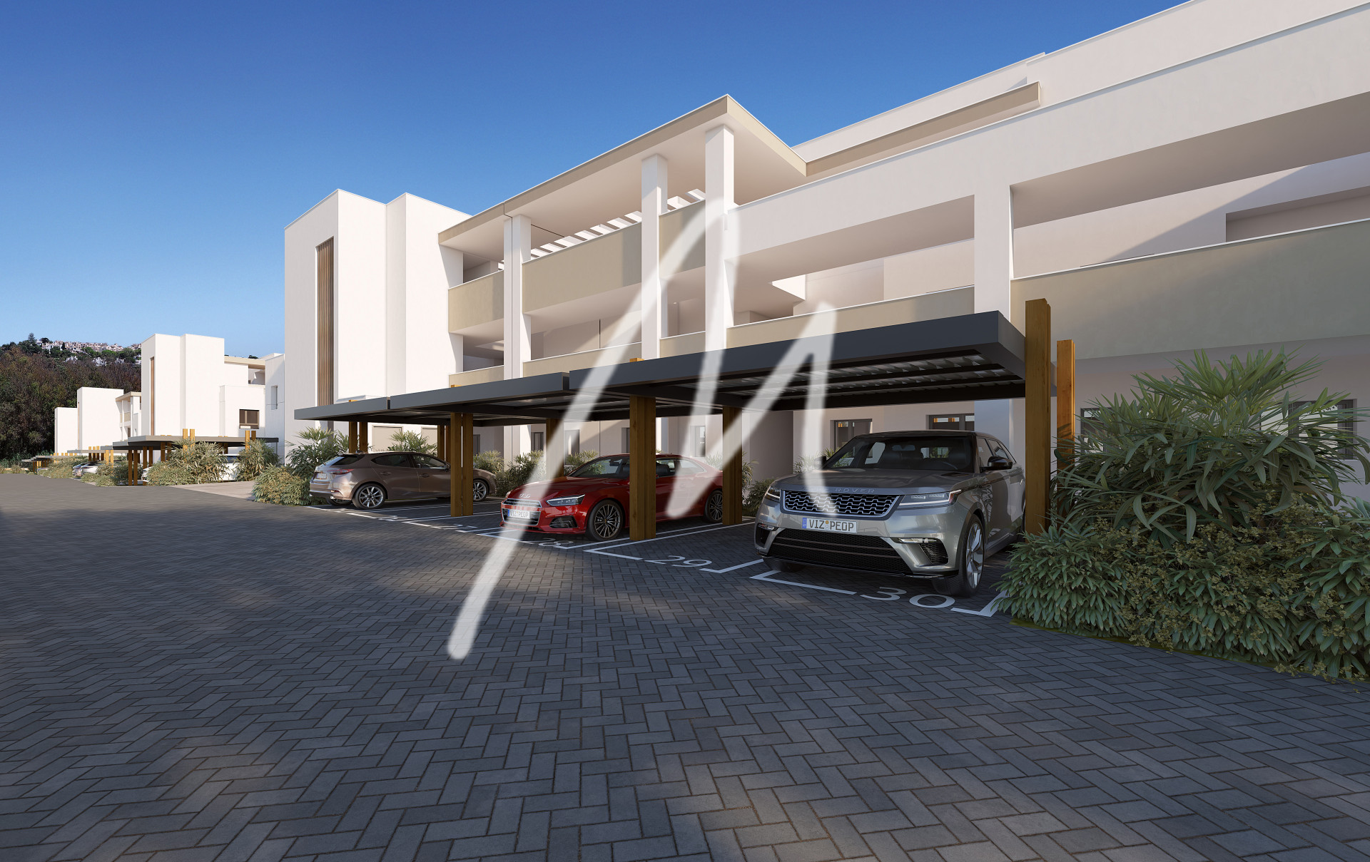 There is an outdoor parking space for each apartment, underneath a pergola to provide shade.