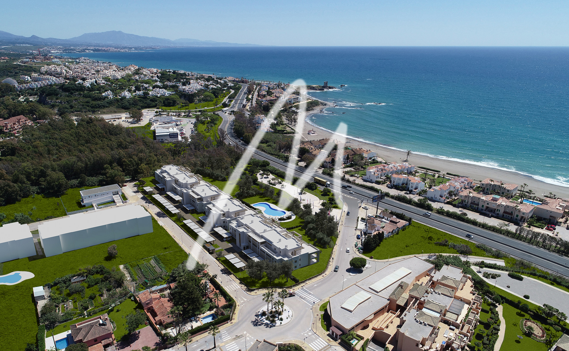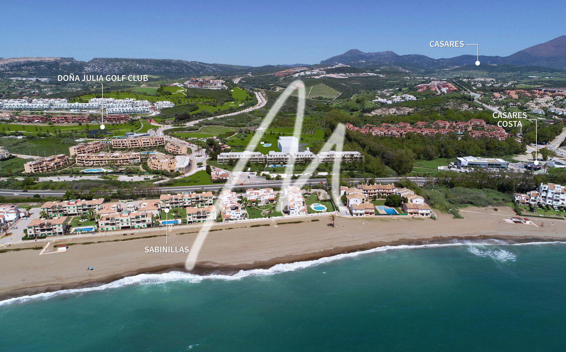 The complex is located between the access roads towards the area of Casares and the Club House at Doña Julia Golf with direct pedestrian access to Playa Ancha, with its fine sand, and around 4 minutes’ drive from Sabinillas and Puerto de La Duquesa, where you will find the very best the area has to offer in local cuisine, sports, and leisure activities.