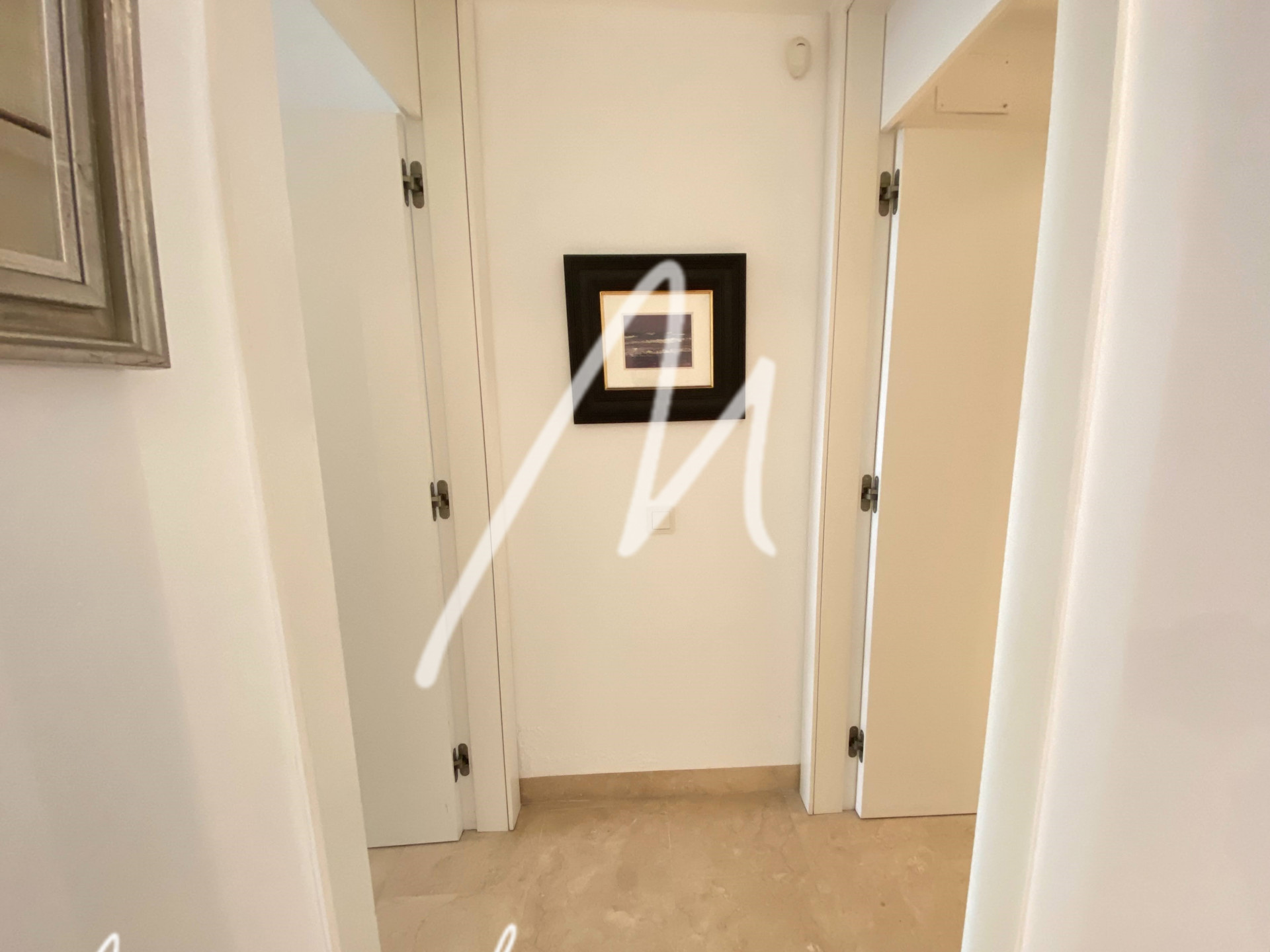 The two large en-suite bedrooms, with ample storage space and white wardrobe fronts, ensure cleanliness and order are guaranteed. The bathrooms maintain the elegance and neutrality of the house, with cream marble cladding, white elements and a whirlpool bath in the master bathroom.