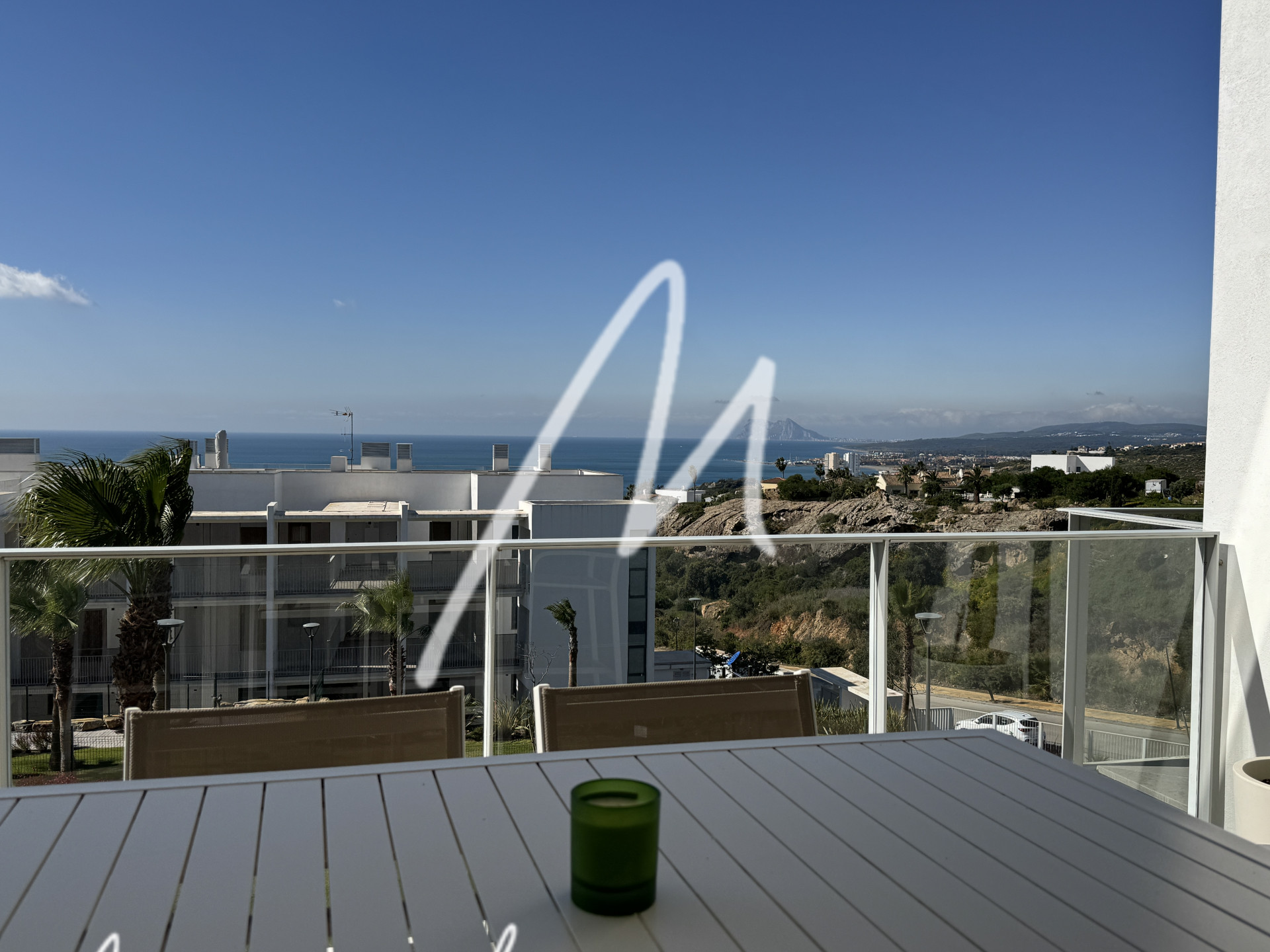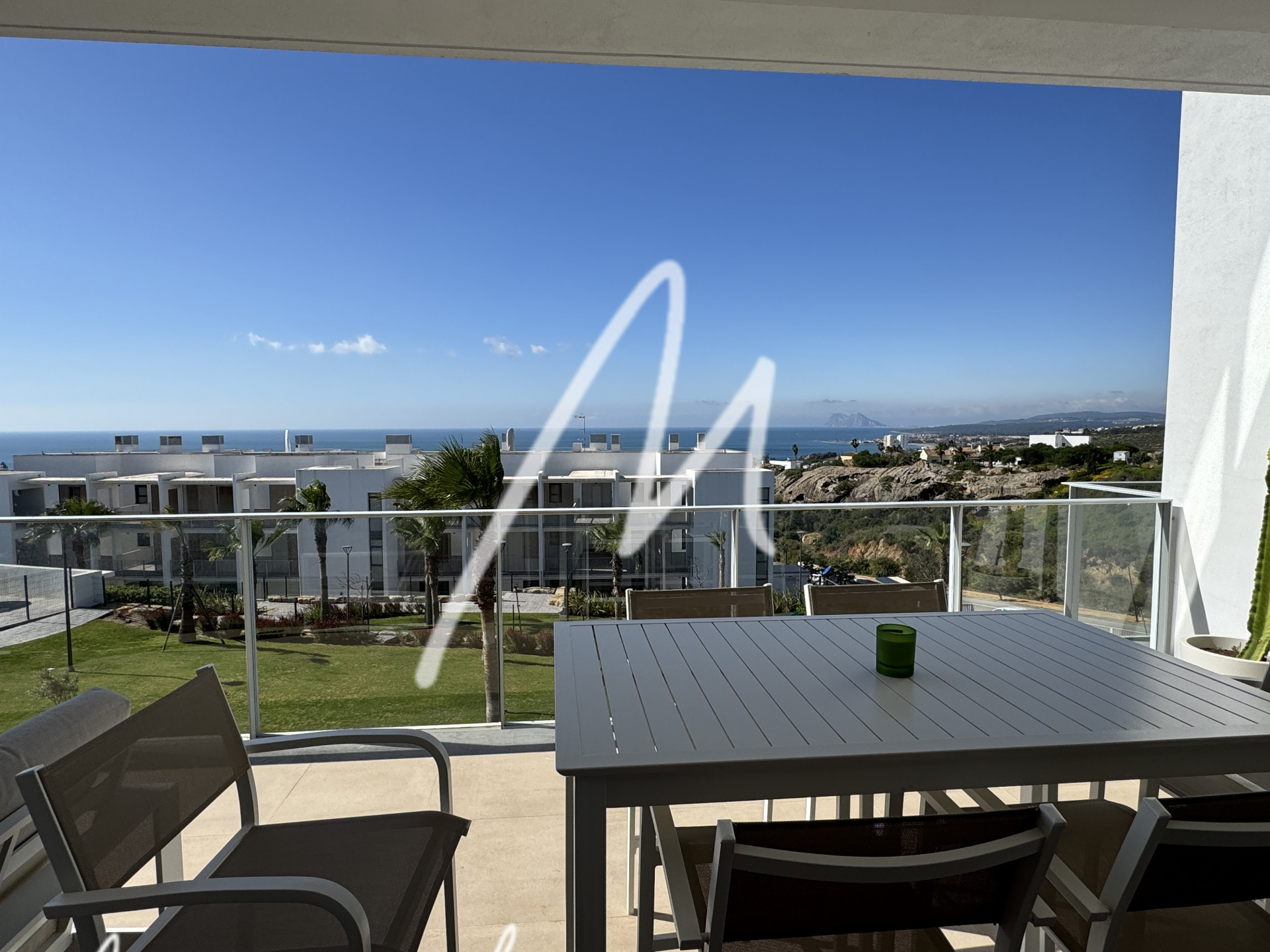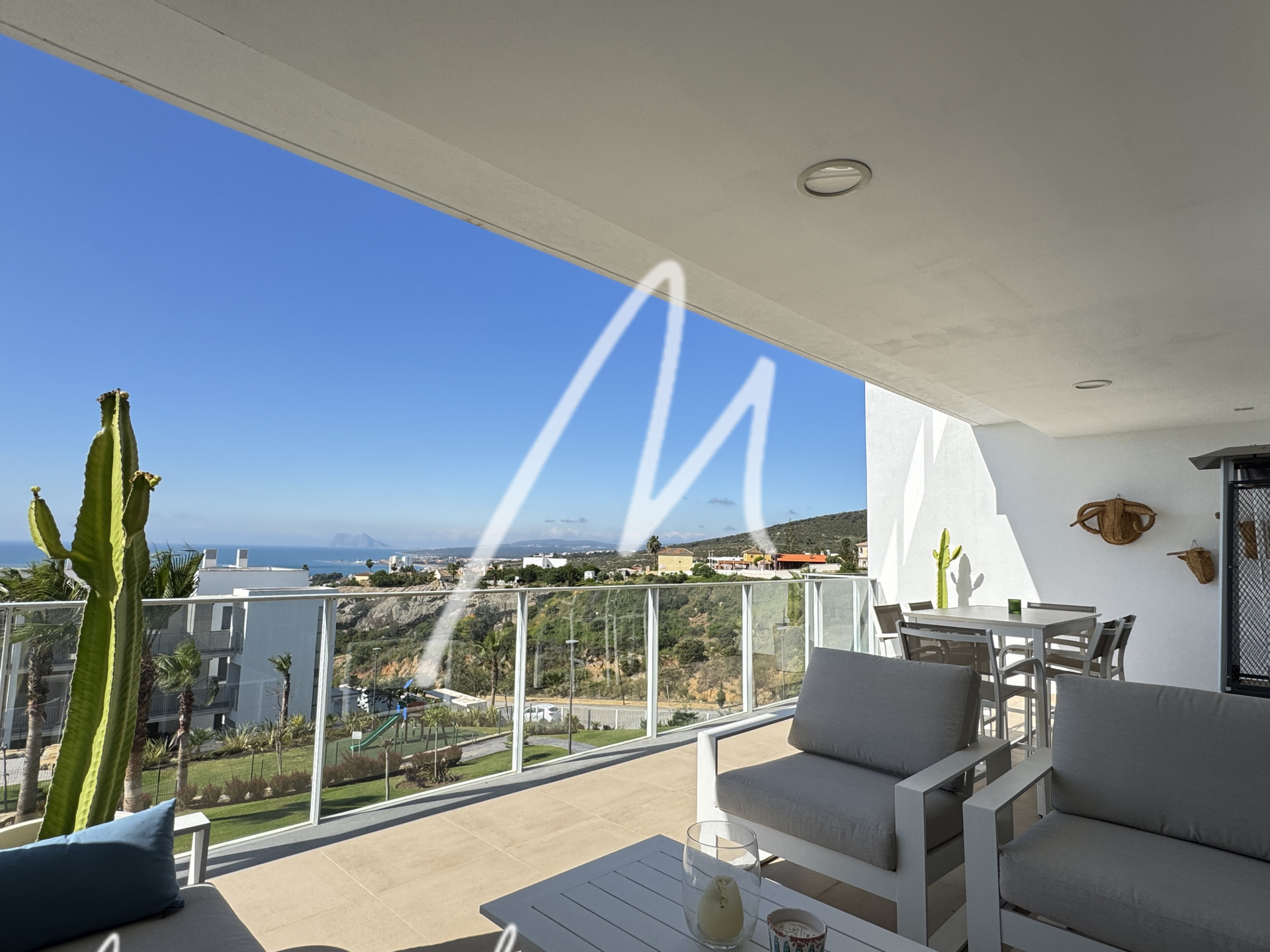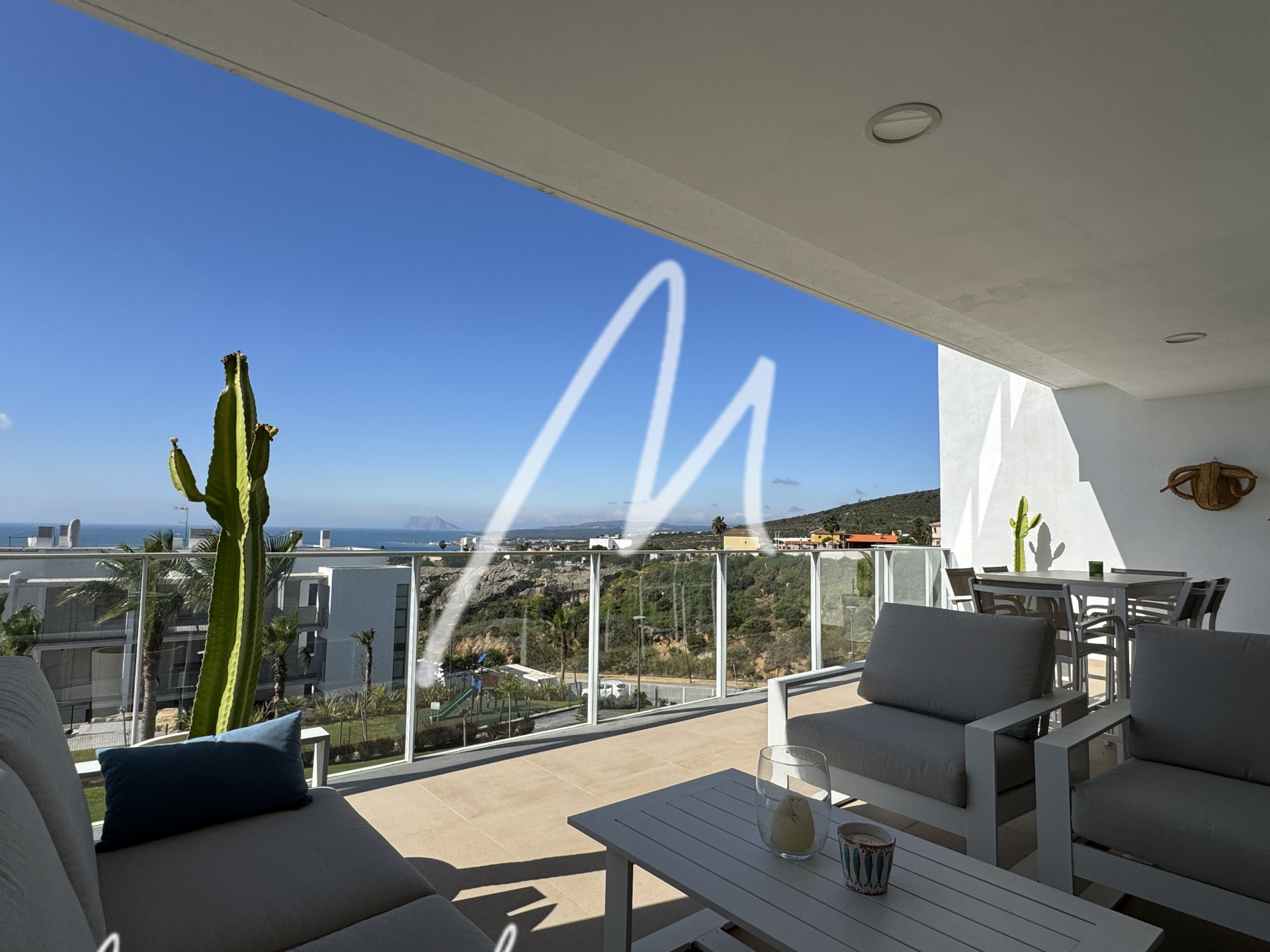Moderno y luminoso apartamento de 3 dormitorios y 2 baños en urbanización privada con piscina, gimnasio y zona infantil. Ubicado en esquina de edificio, con orientación sur y espectacular terraza cubierta de 43 m² con vistas al mar y Gibraltar.