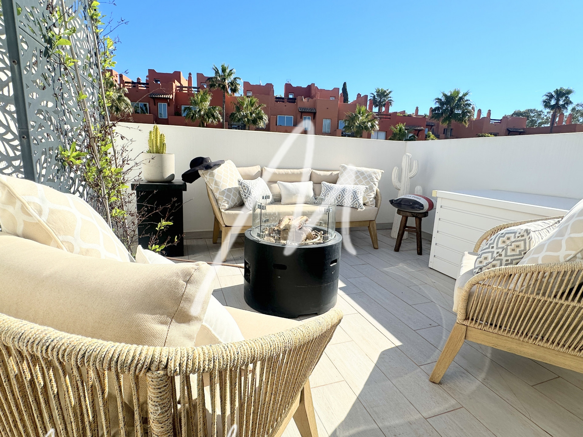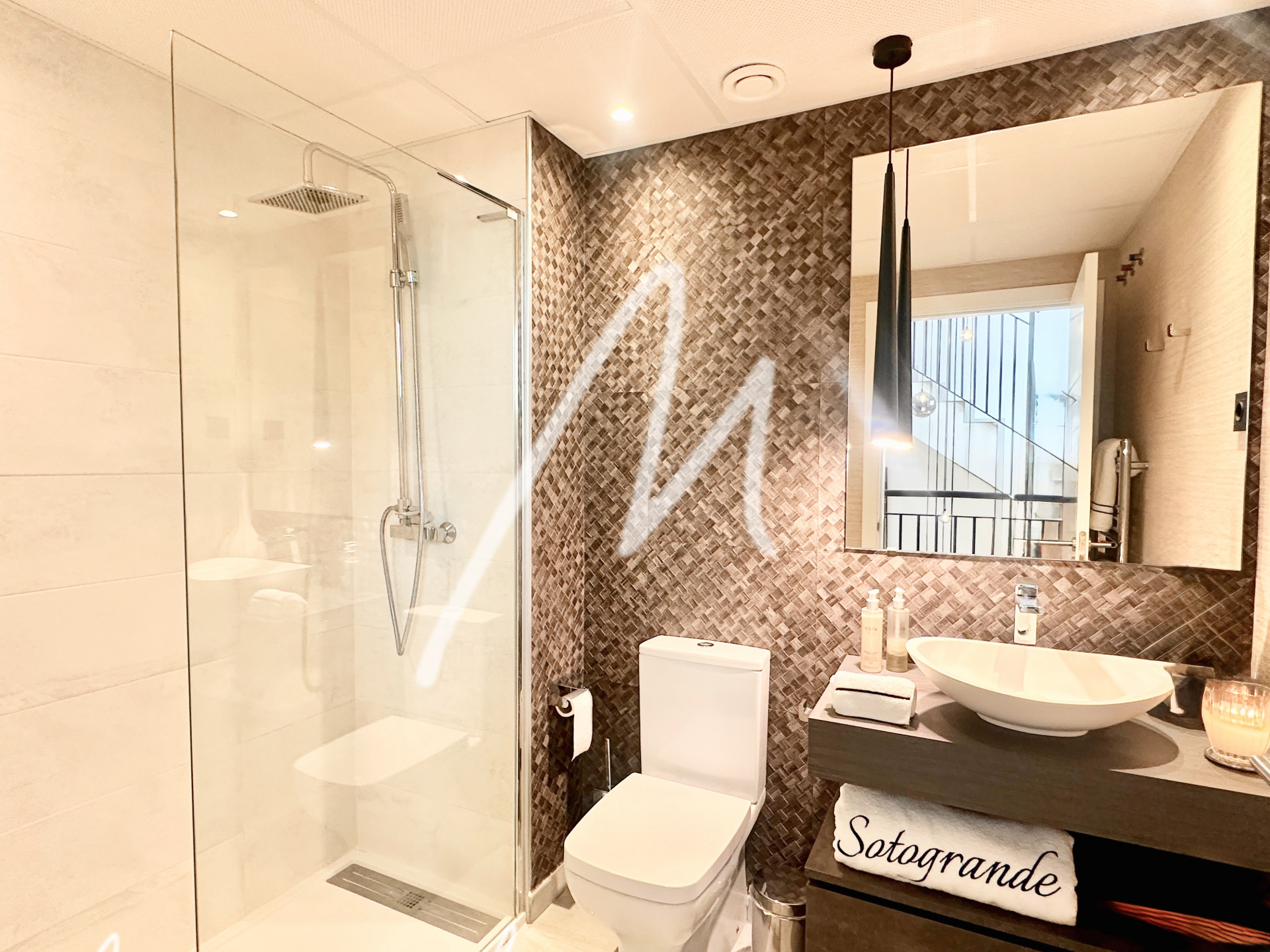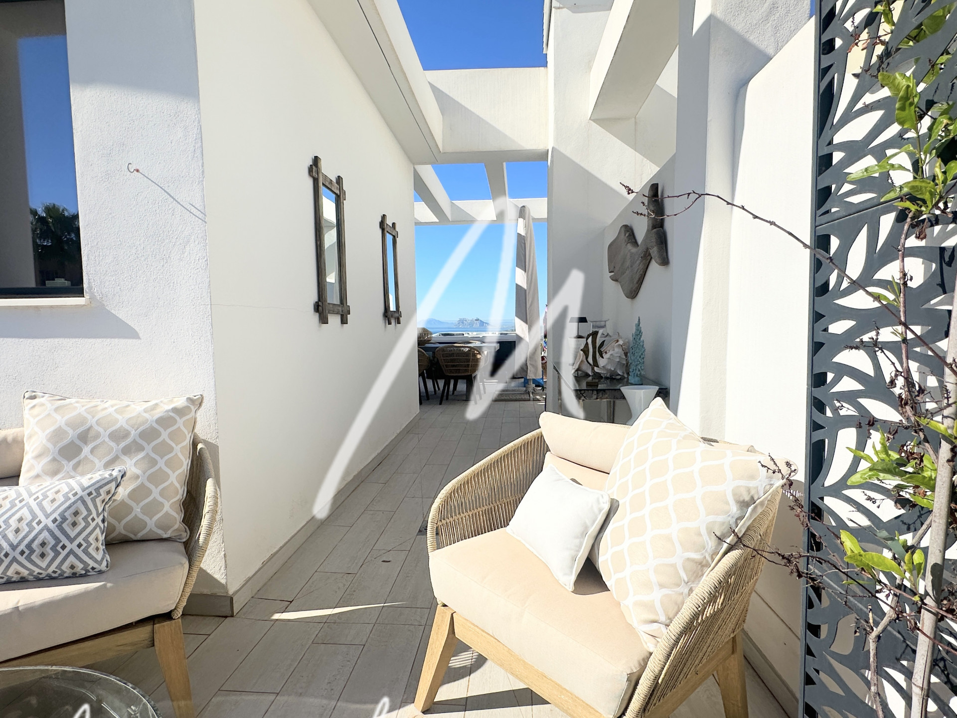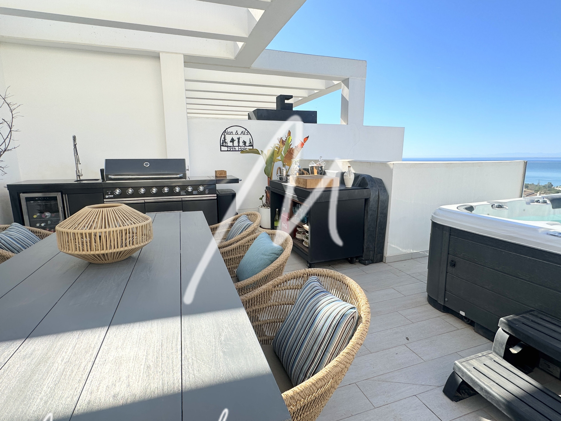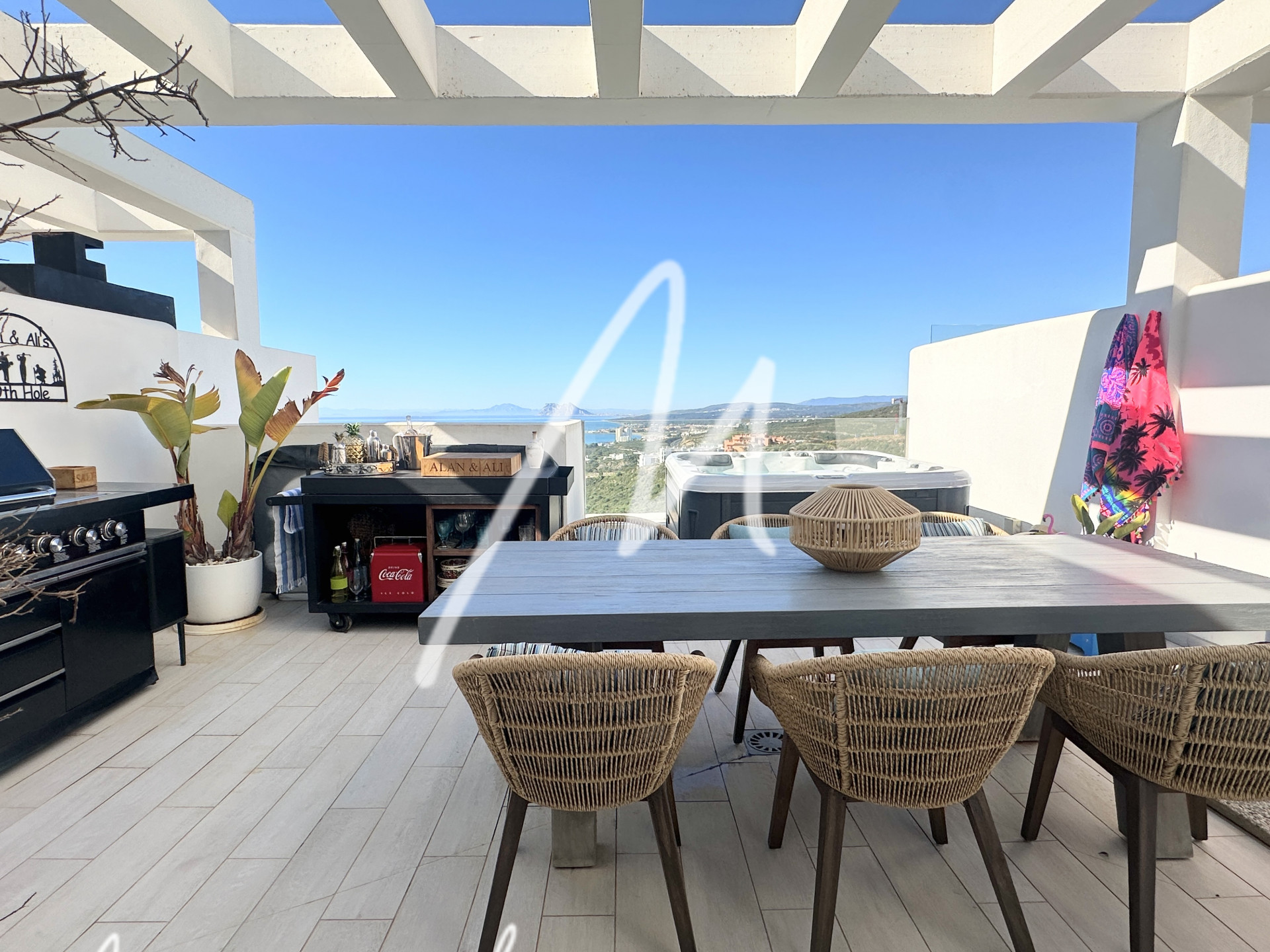 El solárium privado completa la propiedad con zona de barbacoa, fregadero y diferentes ambientes exteriores, con la posibilidad adicional de instalar paneles solares. Una vivienda que combina diseño, confort y vistas, a pocos minutos de Sotogrande, pensada para disfrutar del exterior, de las vistas y de la agradable temperatura de la zona durante todo el año.