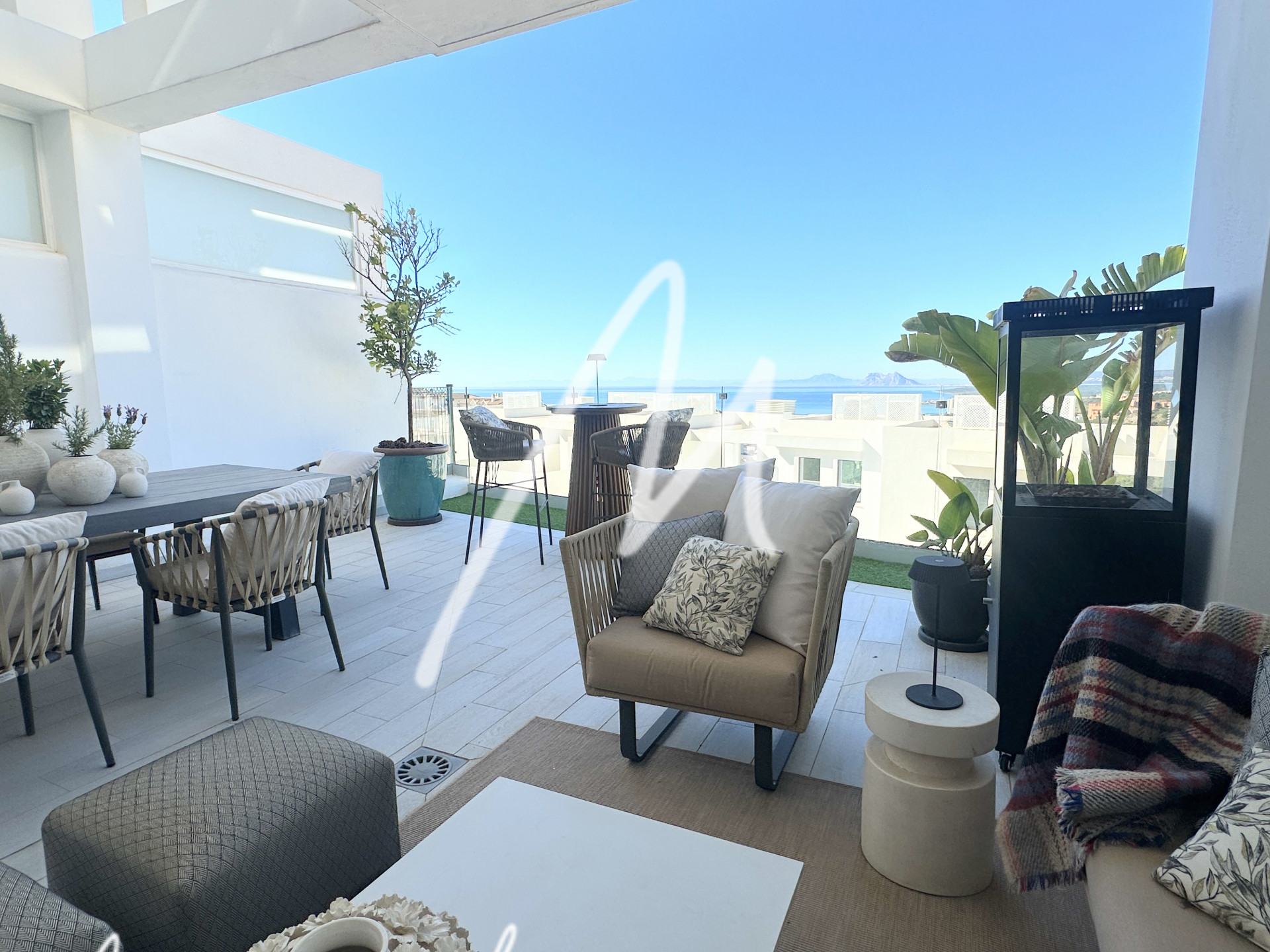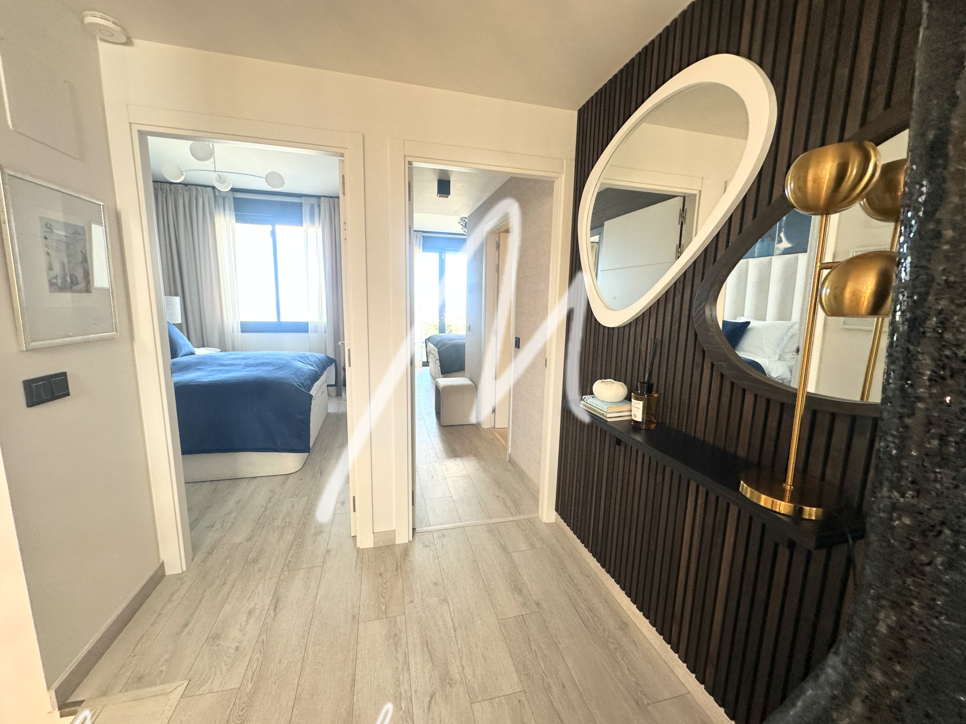La planta principal ofrece un salón con cocina abierta completamente equipada, reformada con una isla central en piedra natural, mayor capacidad de almacenamiento y electrodomésticos Siemens de alta gama. Este espacio se conecta directamente con una terraza que combina zona cubierta y descubierta, ideal para disfrutarla durante todo el año, con vistas abiertas al mar.