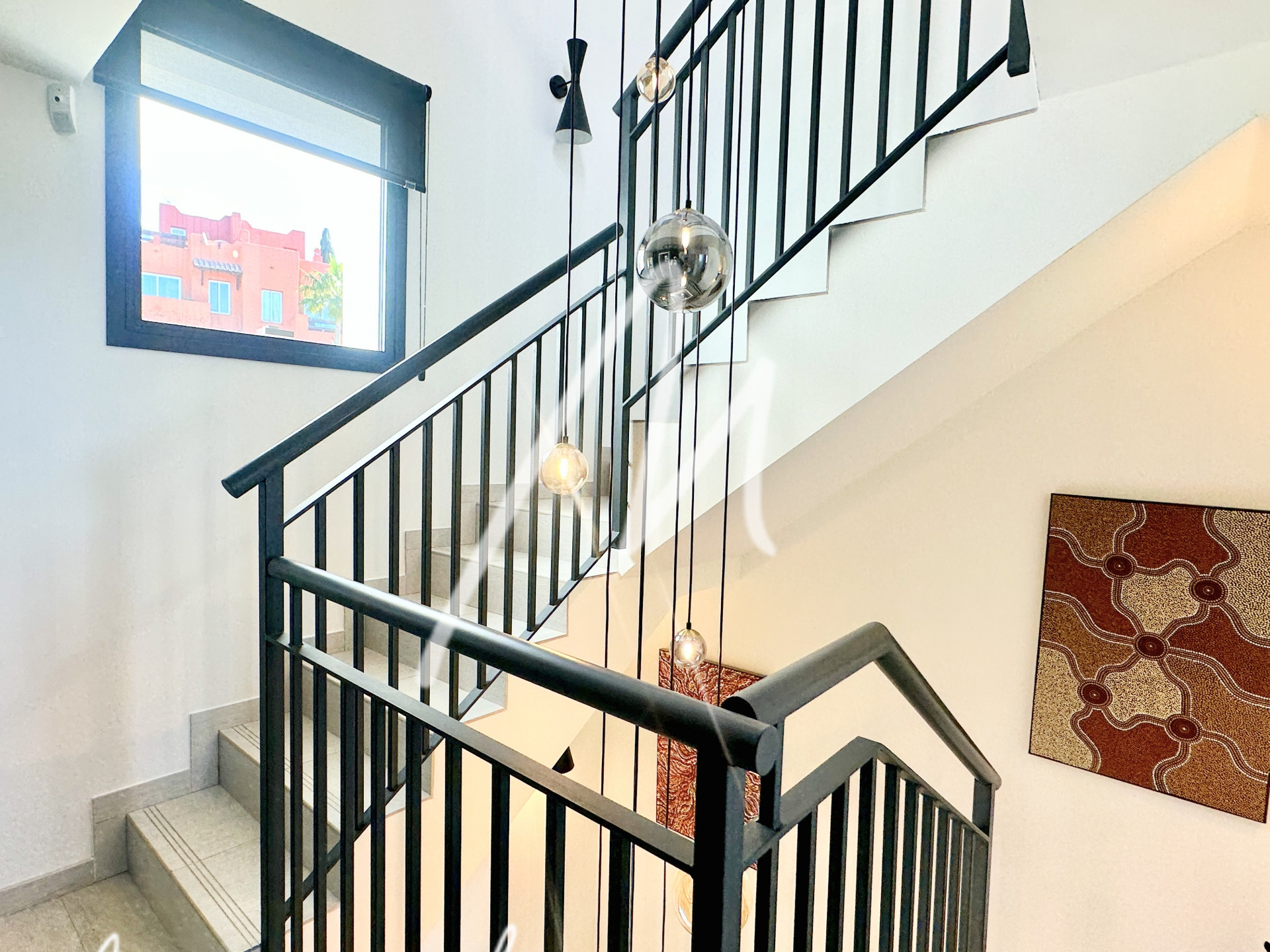 En la planta superior se encuentran tres dormitorios y dos baños, incluyendo el dormitorio principal en suite. En la planta inferior, la vivienda dispone de una versátil zona chill-out, perfecta para relajarse o disfrutar de un ambiente más íntimo, junto a una zona de lavandería y acceso directo a un amplio garaje para dos vehículos con cargador para coche eléctrico.
